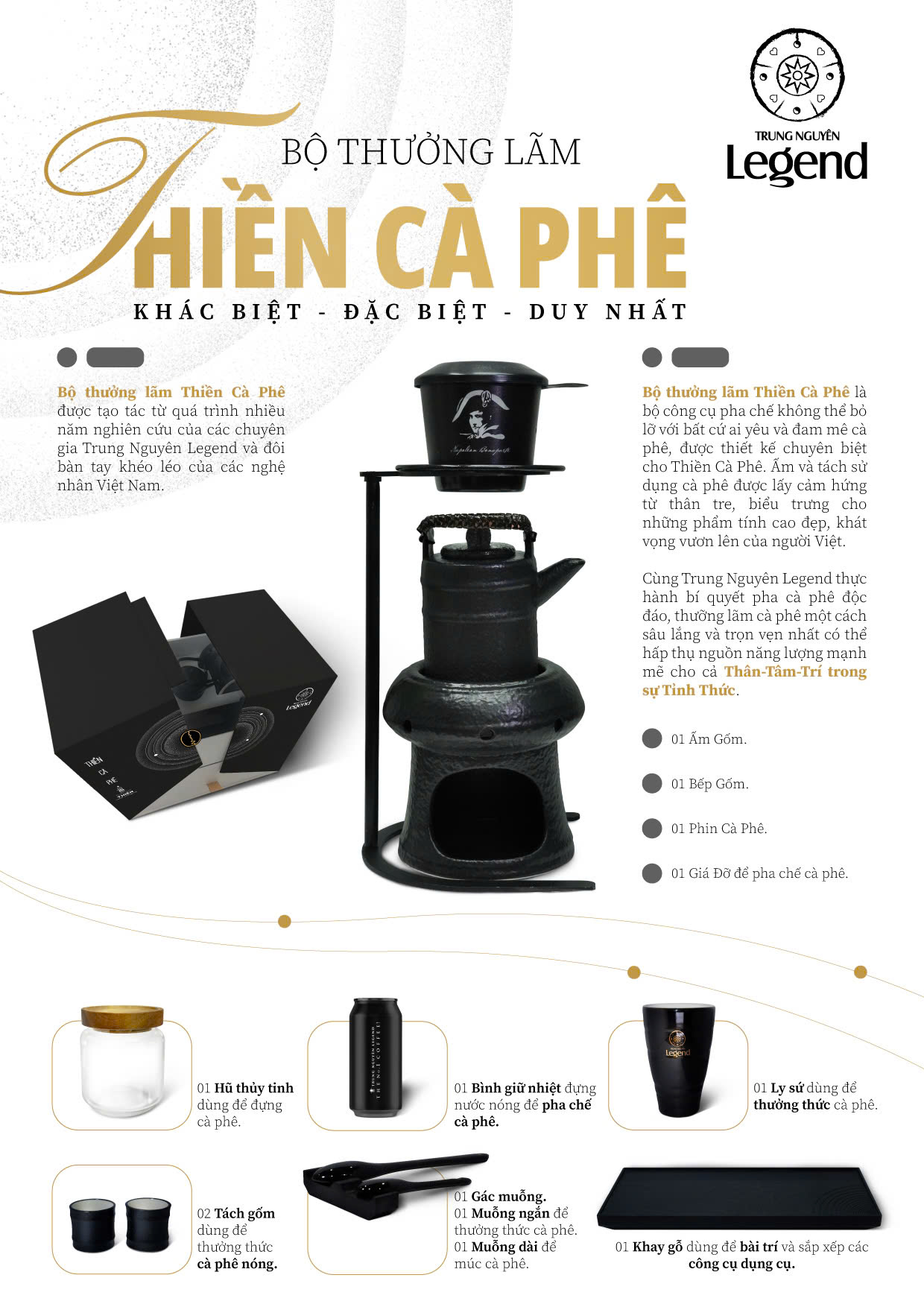 Bộ thưởng lãm Thiền Cà Phê được nghiên cứu bởi các chuyên gia cà phê của Trung Nguyên Legend nhằm mang đến cho khách hàng sự tiện lợi, tinh tế và độc đáo trong quá trình pha chế và thưởng lãm cà phê Thiền. Bộ sản phẩm với 12 dụng cụ được chế tác một cách tinh tế, tỉ mỉ trong từng chi tiết và mang đậm phong cách cà phê phin Việt Nam – độc quyền bởi Tập Đoàn Trung Nguyên Legend.