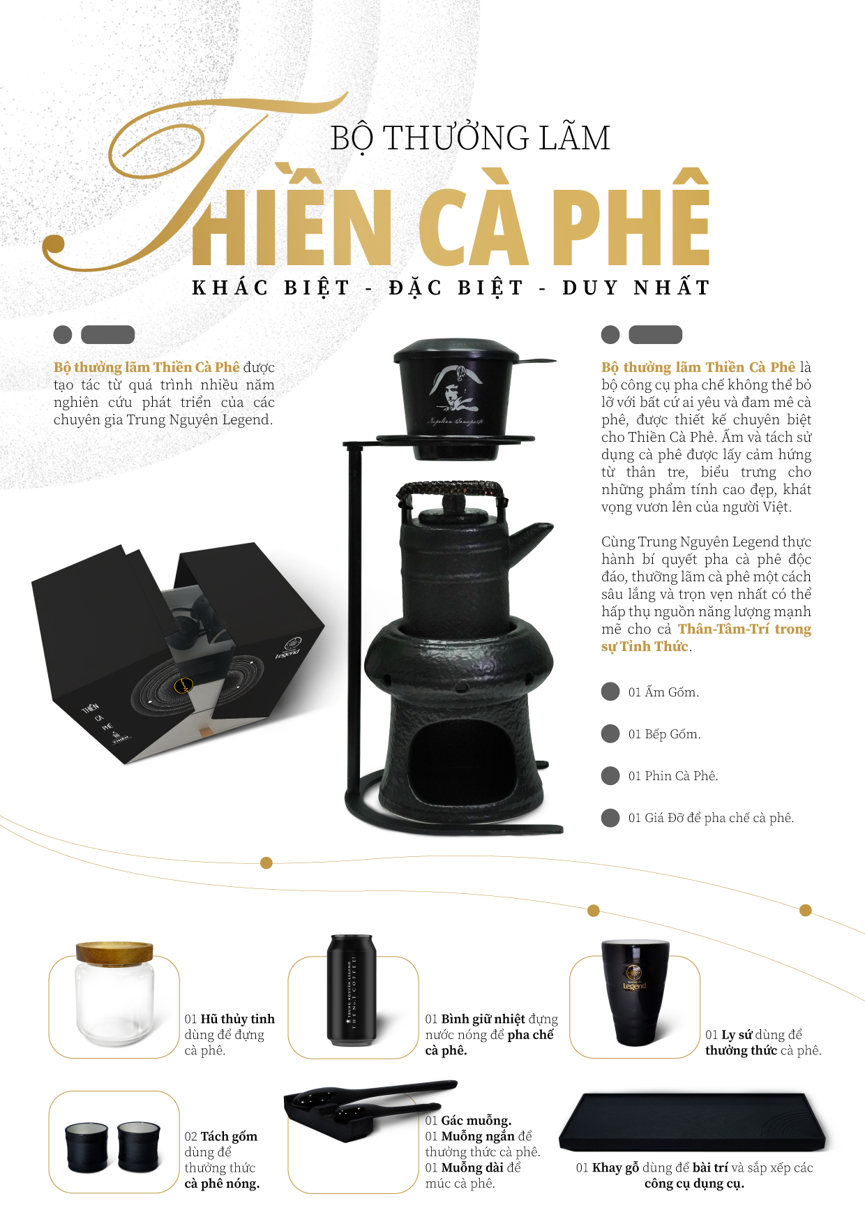 Bộ Thưởng lãm Thiền Cà Phê được tạo tác từ quá trình nhiều năm nghiên cứu phát triển của các chuyên gia Trung Nguyên Legend. Bộ Thưởng lãm Thiền Cà Phê là bộ công cụ pha chế không thể bỏ lỡ với bất cứ ai yêu và đam mê cà phê, được thiết kế chuyên biệt cho Thiền Cà Phê. Ấm và Tách sử dụng cà phê được lấy cảm hứng từ thân tre, biểu trưng cho những phẩm tính cao đẹp, khát vọng vươn lên của người Việt.
