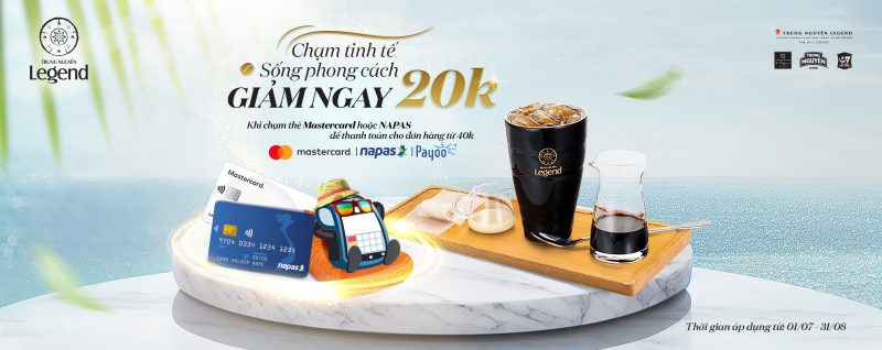 Từ ngày 01/07 đến ngày 31/08/2024, với mỗi lần chạm thẻ Contactless Mastercard ® | Napas trên Payoo POS để thanh toán tại HTQ Trung Nguyên Legend (*), khách hàng sẽ được áp dụng ưu đãi Giảm 20.000đ cho đơn từ 40.000đ.