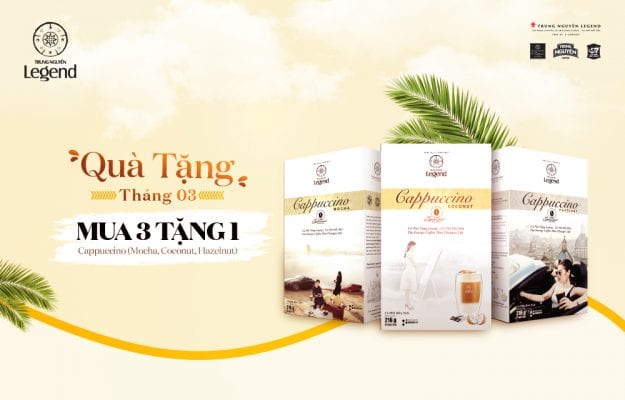 Đặc biệt trong tháng 3 này, khi bạn mua 3 sản phẩm Trung Nguyên Legend Cappuccino tại không gian hoặc order trên app sẽ được tặng thêm 1 sản phẩm cùng loại bất kỳ.