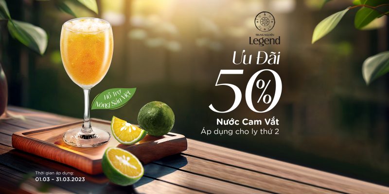 Khách hàng khi mua 2 thức uống bất kỳ, trong đó thức uống thứ 2 là Nước Cam Vắt/ Nước Cam Vắt Đặc Biệt từ ngày 01/03/2023 – hết ngày 31/03/2023 tại cửa hàng Trung Nguyên Legend sẽ được Ưu đãi giảm 50% (trên giá ly thứ 2).