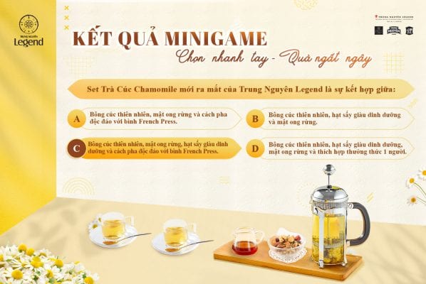 Cảm ơn các bạn đã cùng Trung Nguyên Legend thử tài với minigame “Chọn Nhanh Tay – Quà Ngất Ngây” để khám phá những điều đặc biệt của tuyệt phẩm TRÀ CÚC CHAMOMILE.