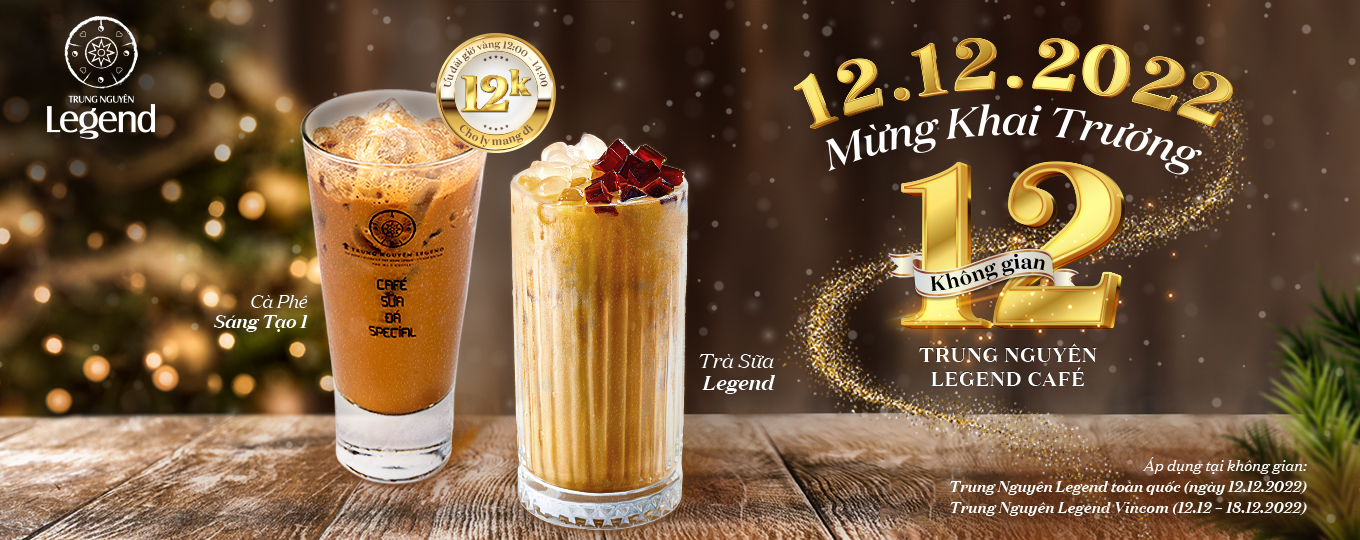 Nội dung: Khách hàng khi mua thức uống Cà Phê Năng Lượng Tư Duy hoặc Trà Sữa Legend vào khung giờ 12:00 – 14:00 ngày 12/12/2022 tại cửa hàng Trung Nguyên Legend toàn quốc & từ ngày 12/12 – hết 18/12/2022 tại cửa hàng Trung Nguyên Legend Vincom sẽ được mua với giá ưu đãi 12,000 vnđ.