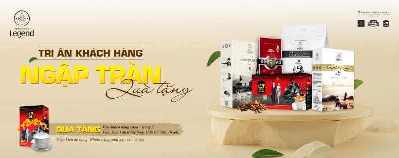 Đặc biệt, từ ngày 18/09 – 18/10/2020, Trung Nguyên Legend Café gửi tặng bạn phần quà năng lượng là 1 hộp Cà Phê G7 3in1 (18 sticks) hoặc 1 Phin cà phê hoa văn trống đồng dành cho đơn hàng sản phẩm cà phê đóng gói (thuộc nhóm sản phẩm cà phê rang xay, hòa tan) có giá trị từ 359,000đ trở lên.