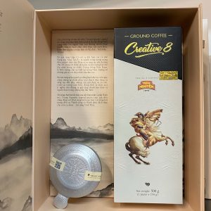 Bộ quà tặng Giàu có với sự kết hợp của Cà phê Rang xay Sáng tạo 8 – là nguồn năng lượng mang đến sự tỉnh thức cho Thân và sự sáng tạo phi thường cho Trí; cùng với chiếc phin pha cà phê mang hoa văn lấy cảm hứng từ chiếc trống đồng Việt Nam, là biểu tượng cho sự tĩnh tại trong Tâm, hướng về những giá trị tốt đẹp nhất của dân tộc. Bộ sản phẩm sẽ là người bạn đồng hành đắc lực mỗi ngày cùng chúng ta chinh phục mọi thách thức bằng sự sáng tạo đột phá, nhưng vẫn giữ được sự an yên, tĩnh tại trong tâm hồn, đồng thời là món quà ý nghĩa cho chúng ta gửi tặng chính bản thân và người thân trong những dịp đặc biệt.