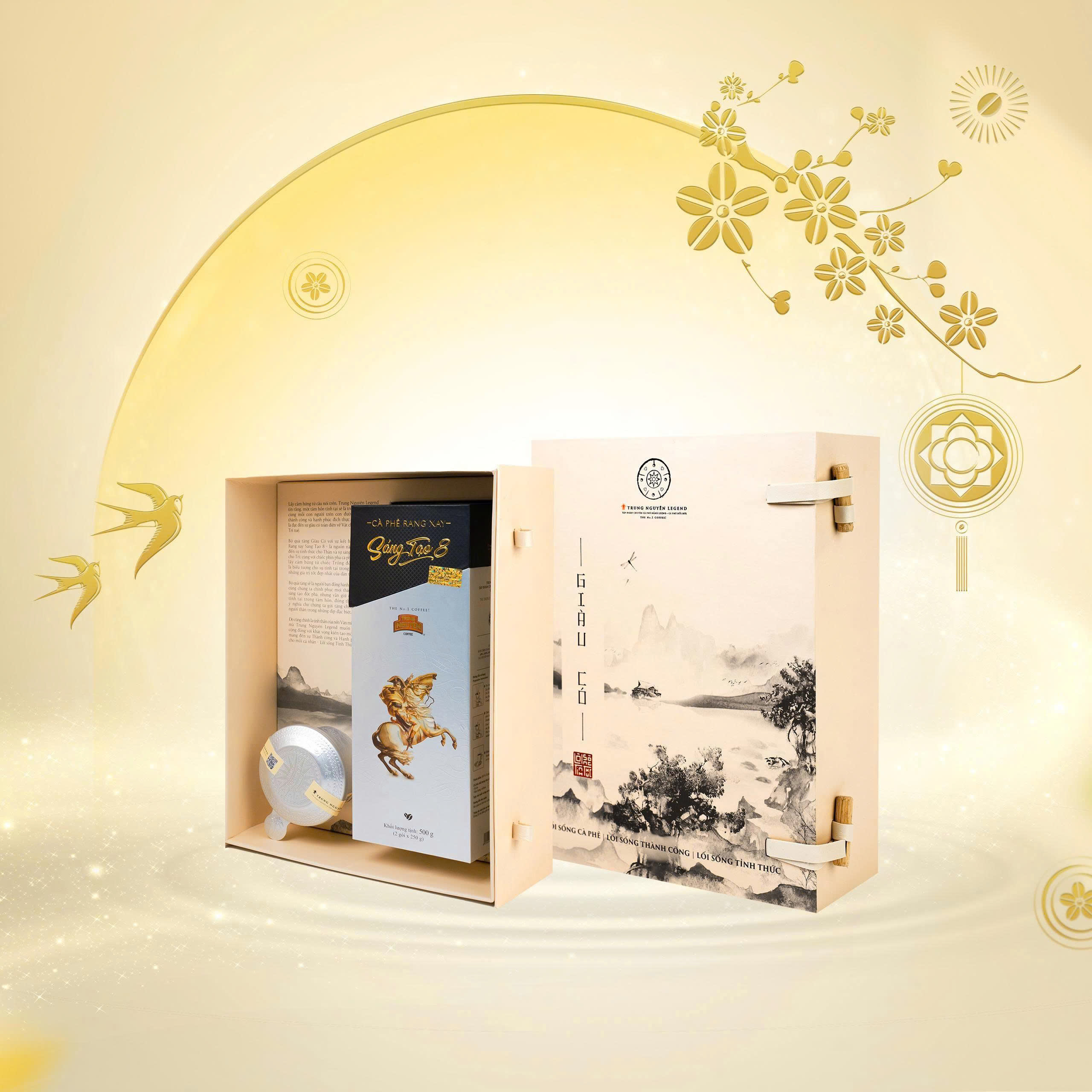 Bộ quà tặng Giàu có với sự kết hợp của Cà phê Rang xay Sáng tạo 8 – là nguồn năng lượng mang đến sự tỉnh thức cho Thân và sự sáng tạo phi thường cho Trí; cùng với chiếc phin pha cà phê mang hoa văn lấy cảm hứng từ chiếc trống đồng Việt Nam, là biểu tượng cho sự tĩnh tại trong Tâm, hướng về những giá trị tốt đẹp nhất của dân tộc. Bộ sản phẩm sẽ là người bạn đồng hành đắc lực mỗi ngày cùng chúng ta chinh phục mọi thách thức bằng sự sáng tạo đột phá, nhưng vẫn giữ được sự an yên, tĩnh tại trong tâm hồn, đồng thời là món quà ý nghĩa cho chúng ta gửi tặng chính bản thân và người thân trong những dịp đặc biệt.