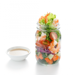 Thành phần nguyên liệu: Xà lách | Cà rốt | Dưa leo | Cà chua bi | Bông cải xanh | Bắp cải tím | Tôm | Sốt mè.
