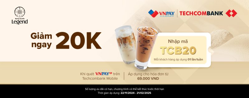 Từ ngày 22/11/2024 đến 21/02/2025, khi bạn thanh toán bằng VNPAY trên ứng dụng Techcombank Mobile tại tất cả các hệ thống Trung Nguyên Legend và Thế Giới Cà Phê Trung Nguyên Legend, bạn sẽ nhận ngay ưu đãi giảm 20.000Đ cho đơn hàng từ 69.000Đ.