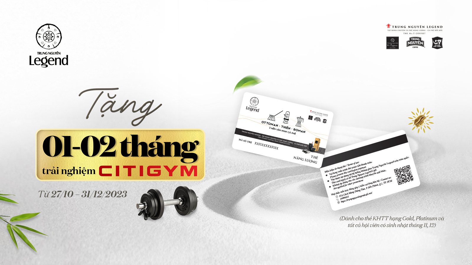 - Cách thức nhận ưu đãi: mã E-Voucher thẻ tập miễn phí tại CITIGYM sẽ được phát hành qua Mobile App Trung Nguyên Legend Cafe cho tất cả khách hàng thành viên Trung Nguyên Legend thỏa điều kiện chương trình.