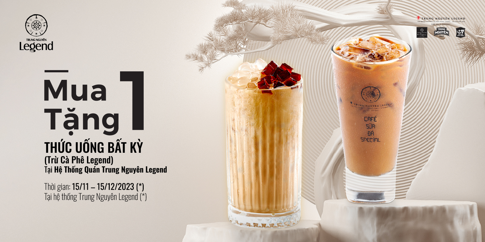 - Thức uống tặng: thức uống bất kỳ toàn menu (trừ Cà Phê Legend).