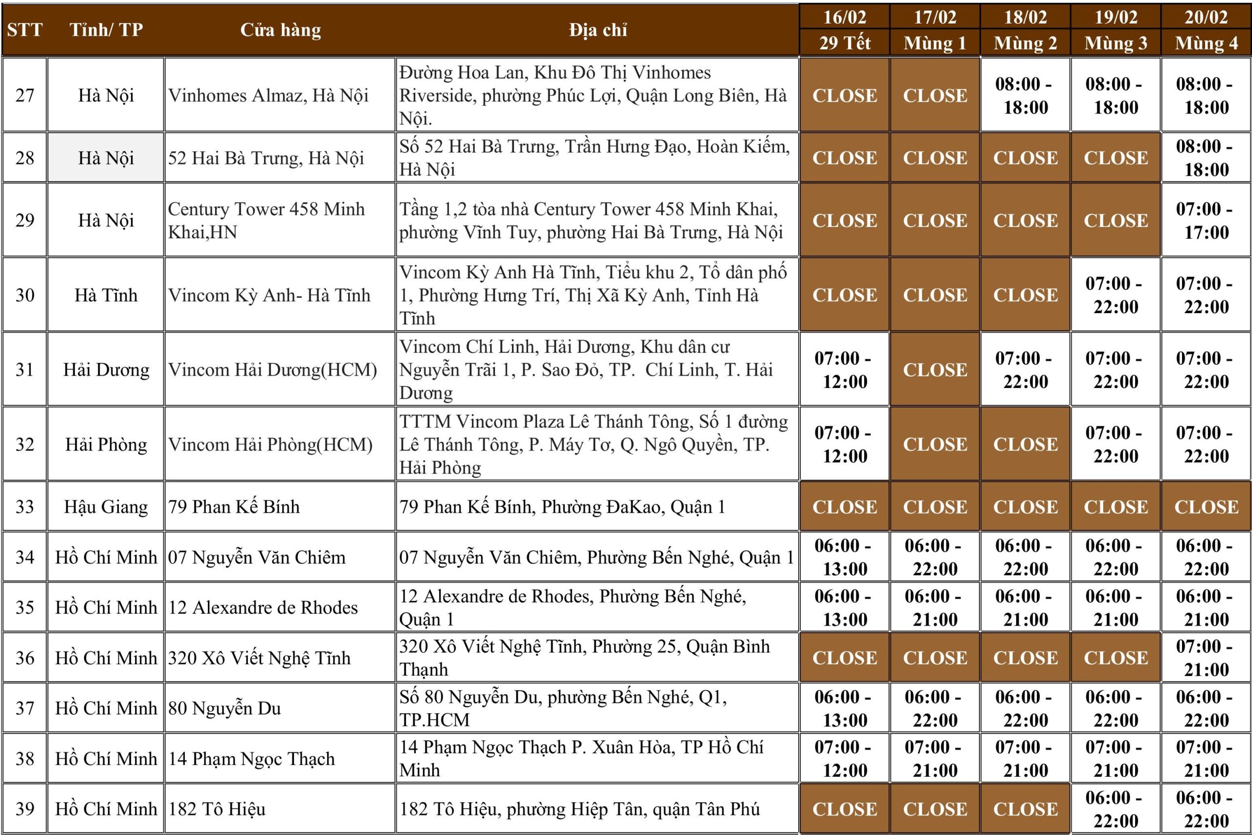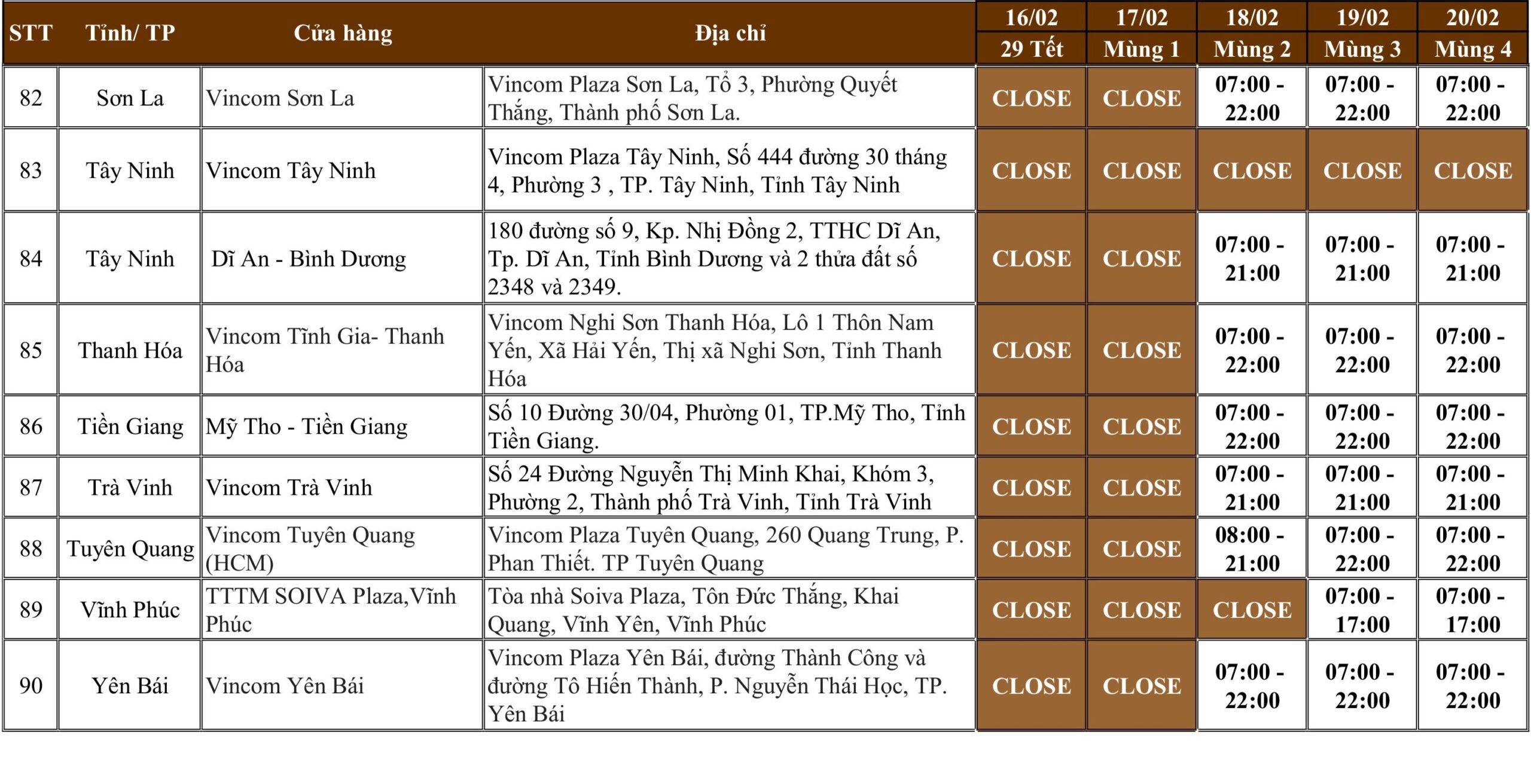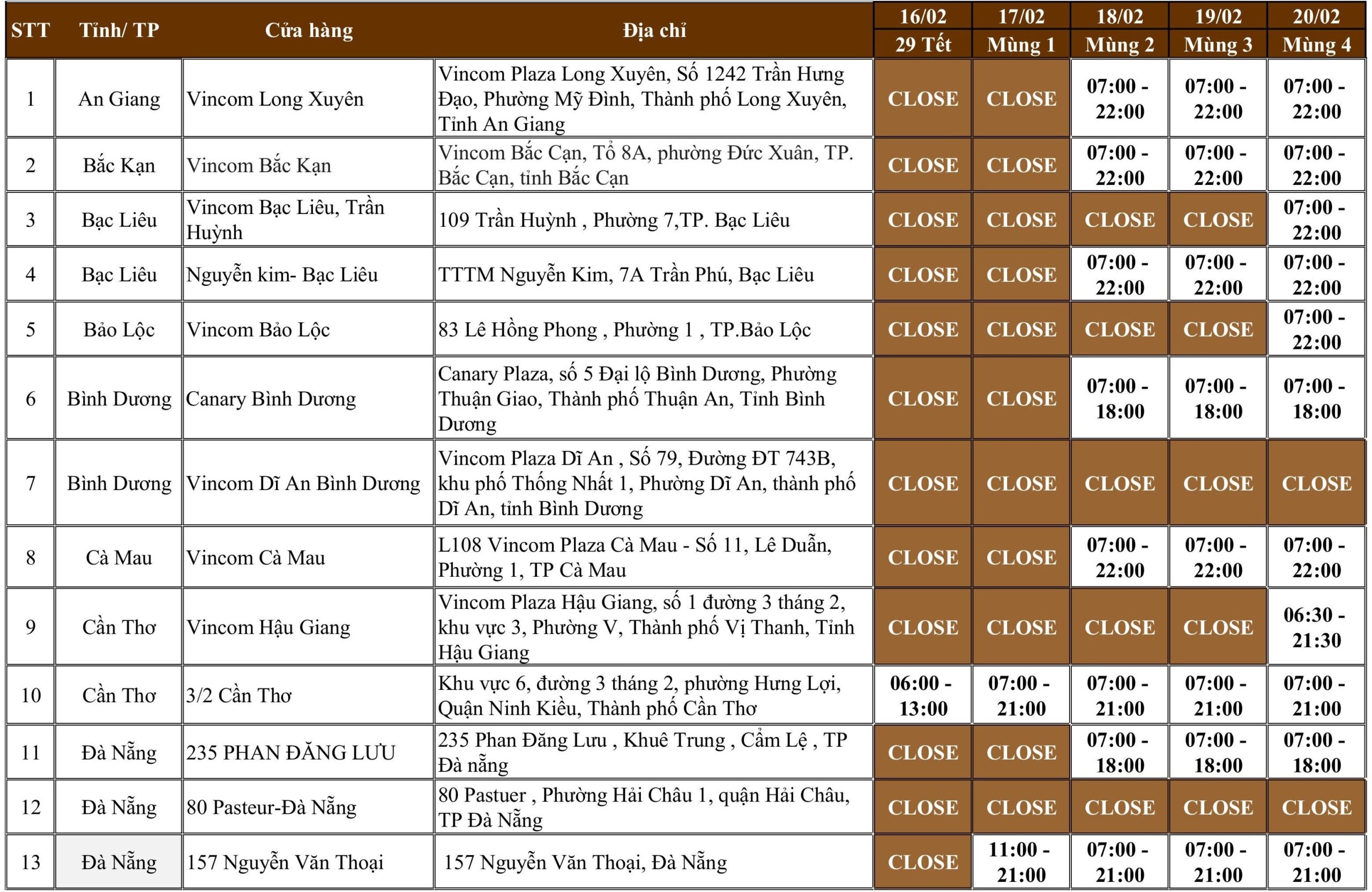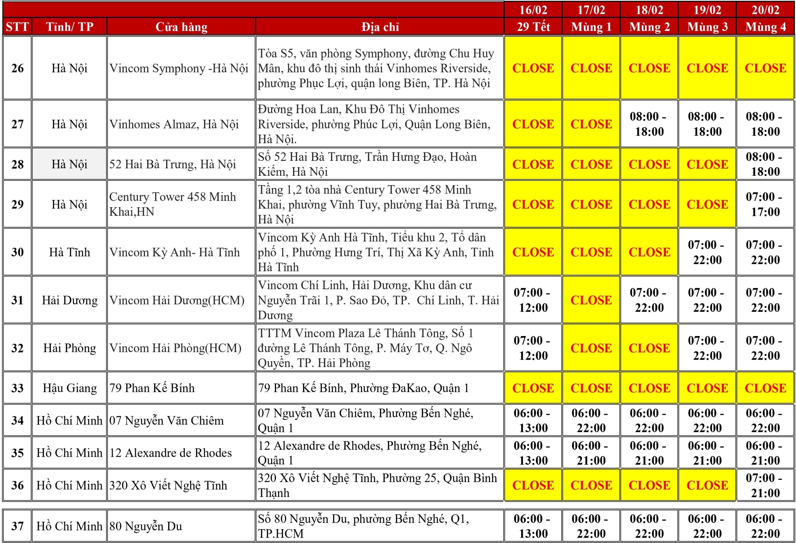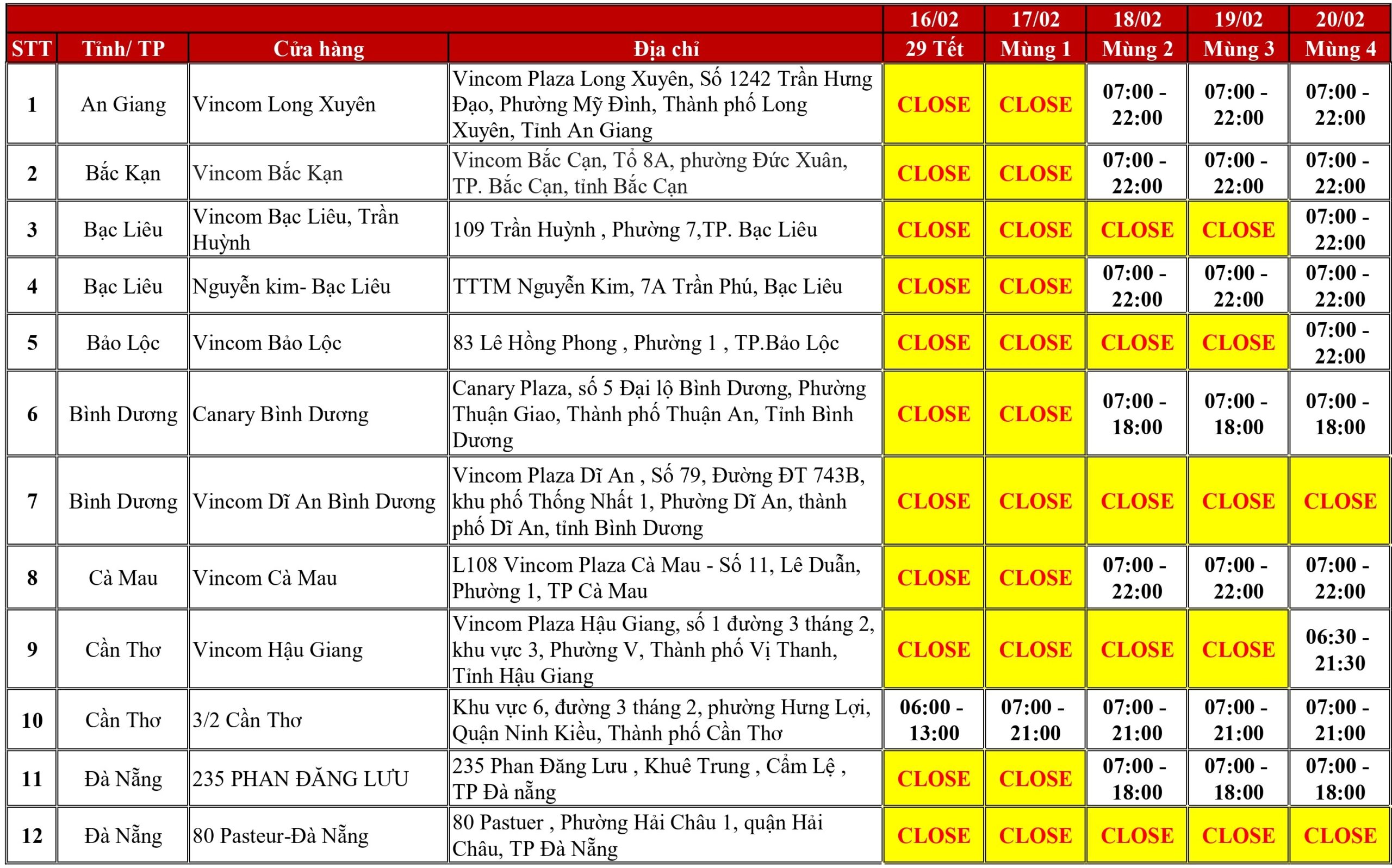 Quý Khách vui lòng xem chi tiết lịch hoạt động Tết của từng cửa hàng theo danh sách bên dưới: