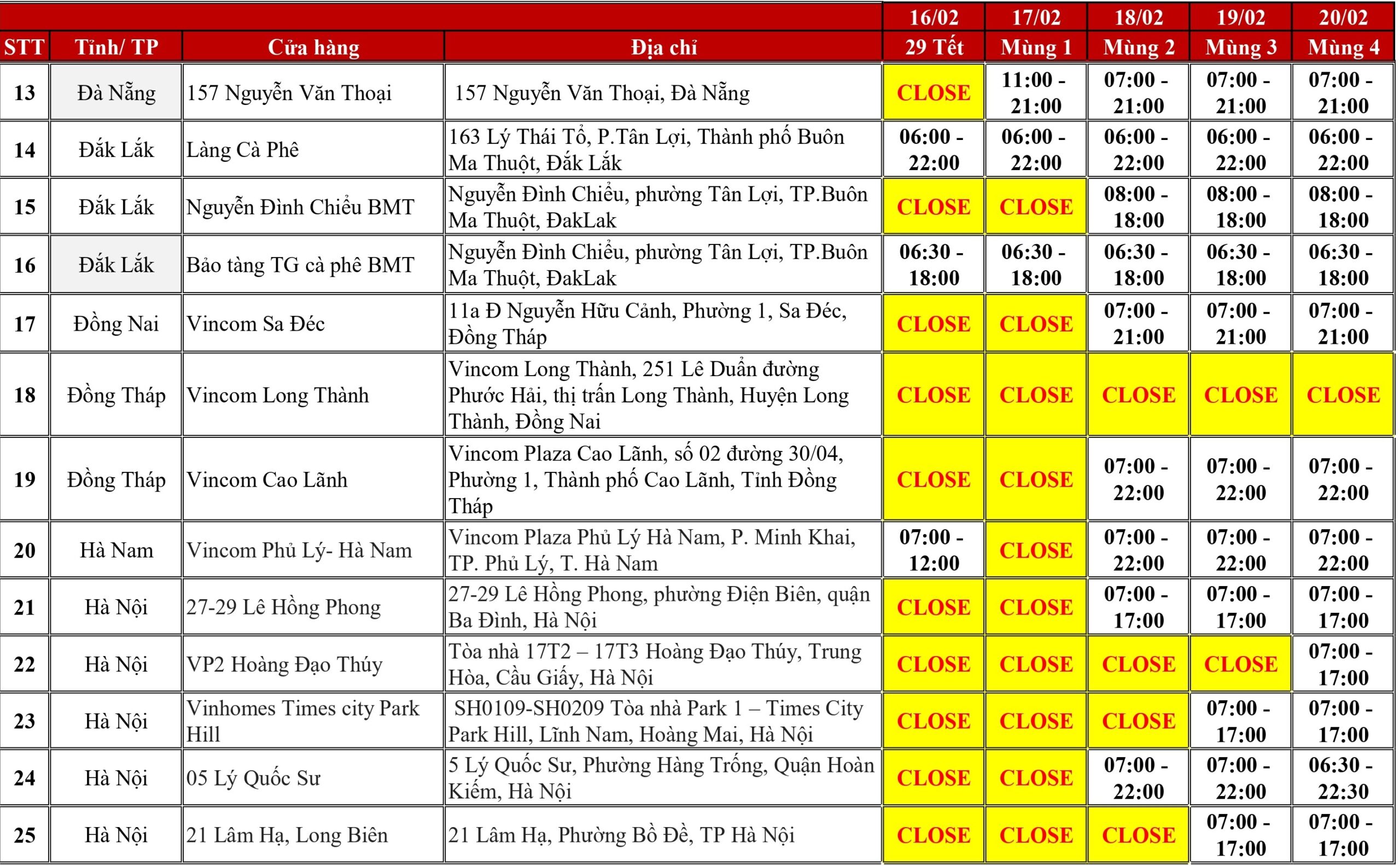 Trung Nguyên Legend Café trân trọng thông báo đến Quý Khách hàng lịch hoạt động Tết của các cửa hàng trên toàn hệ thống như sau: