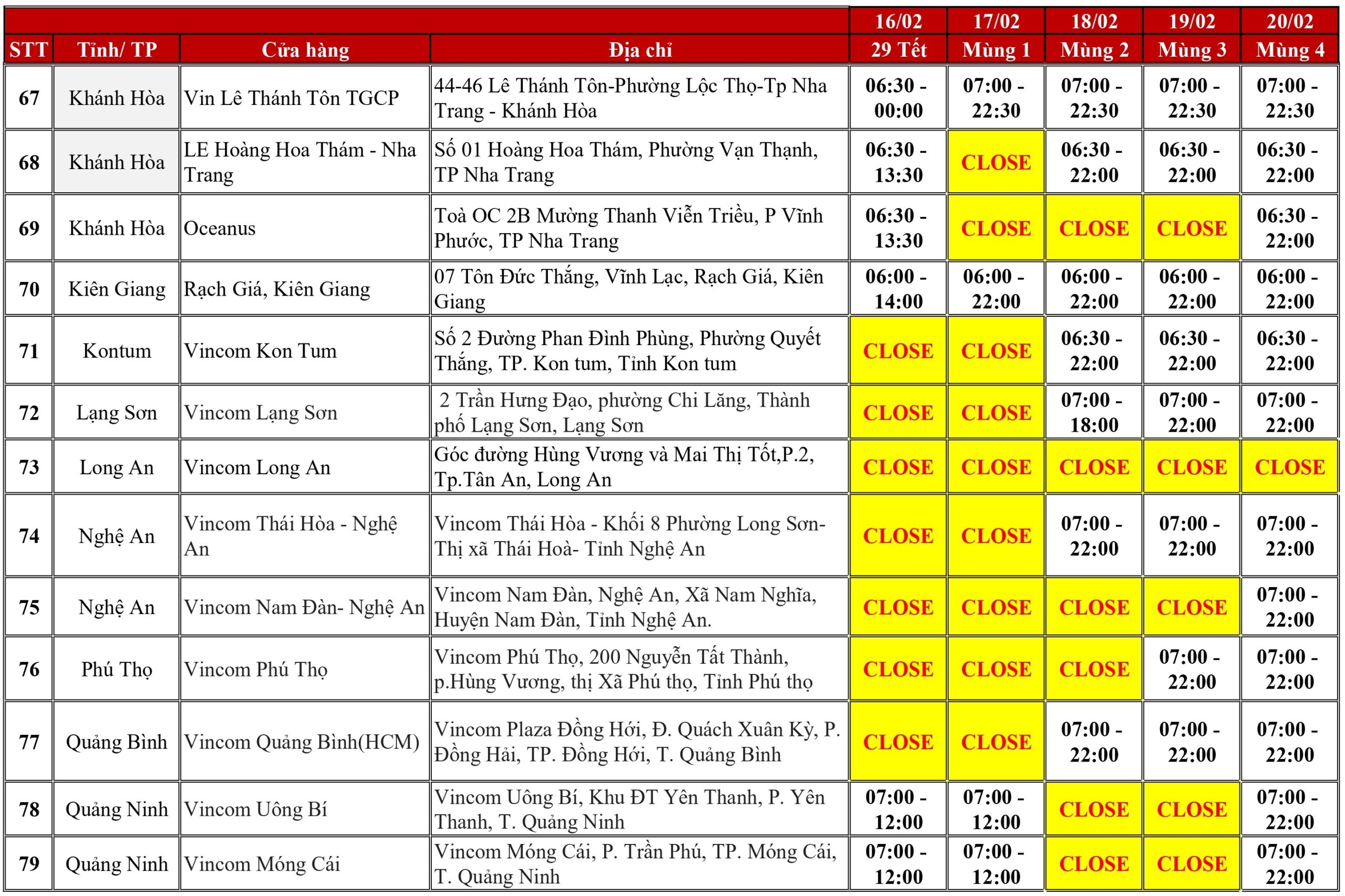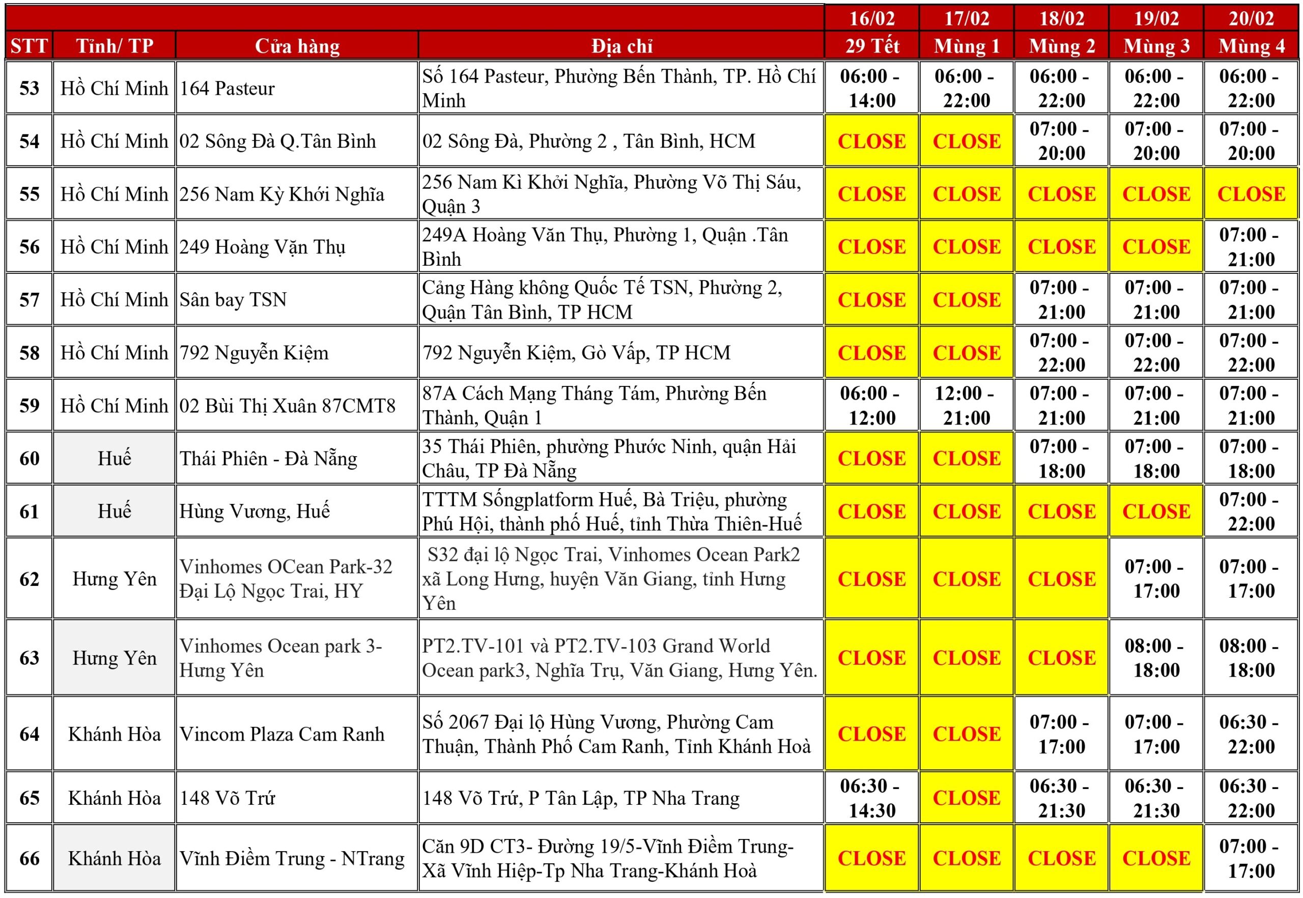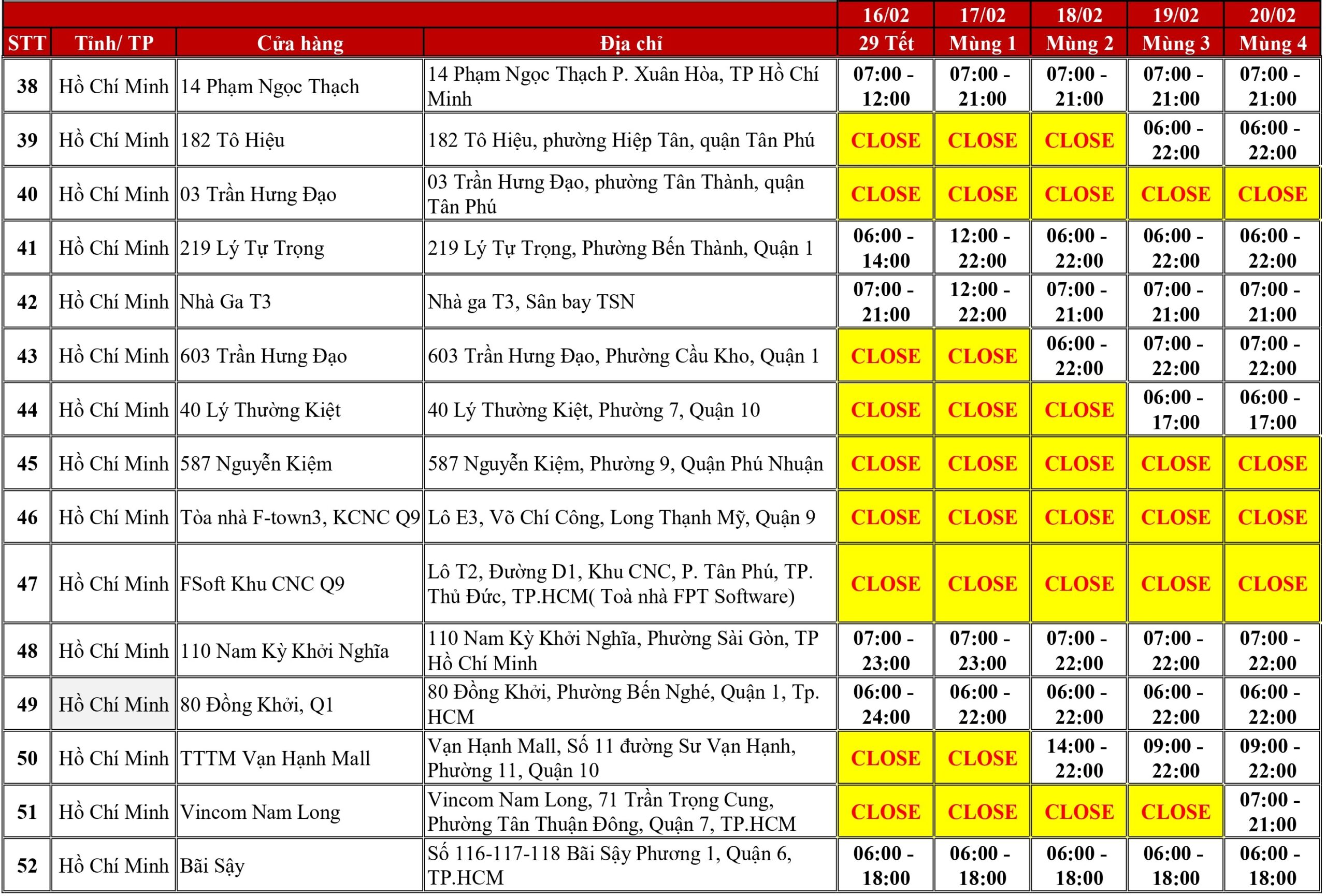 STT Tỉnh/ TP Cửa hàng Địa chỉ 29 Tết Mùng 1 Mùng 2 Mùng 3 Mùng 4