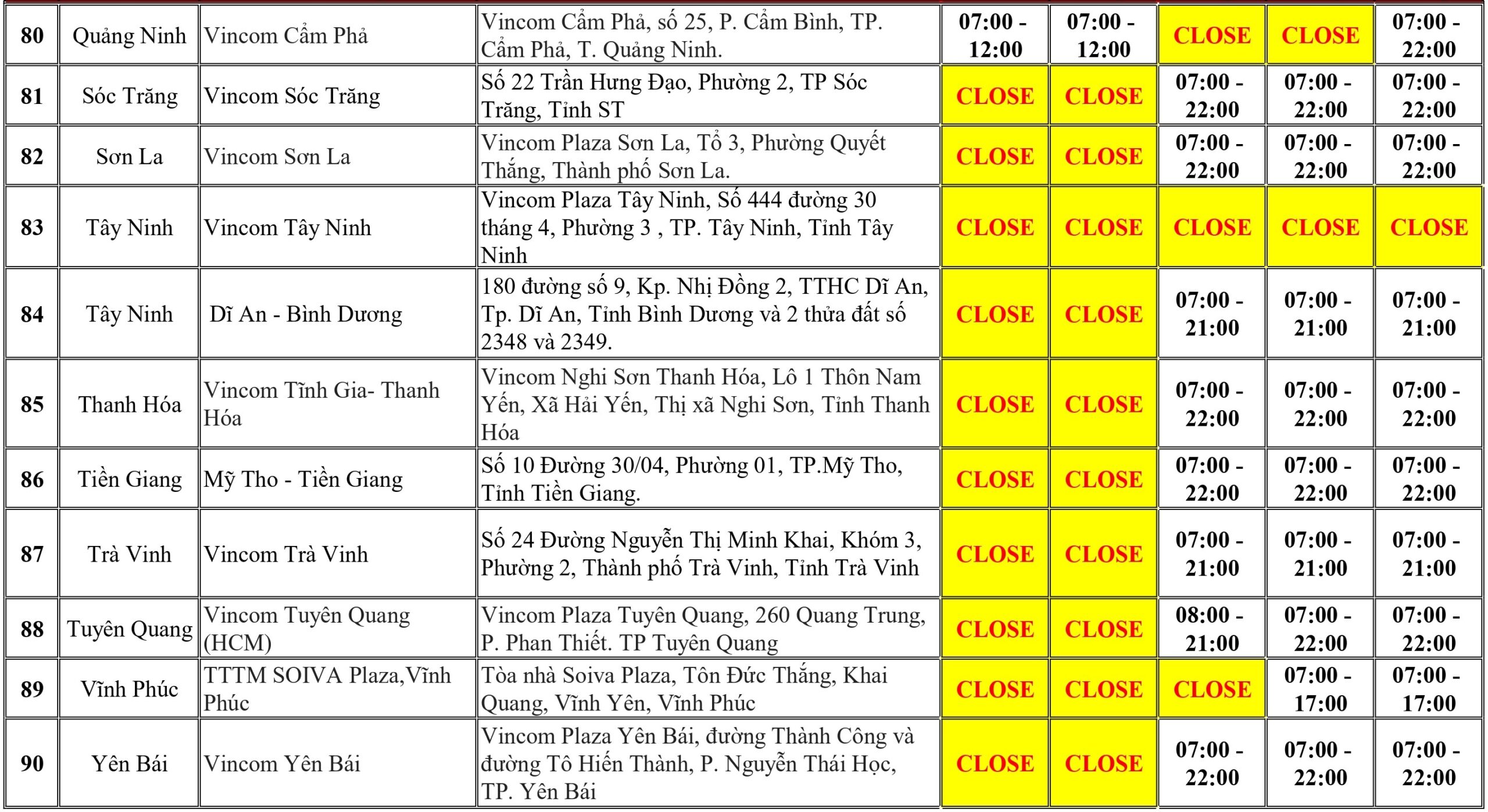 81 Sóc Trăng Vincom Sóc Trăng Số 22 Trần Hưng Đạo, Phường 2, TP Sóc Trăng, Tỉnh ST CLOSE CLOSE 07:00 – 22:00 07:00 – 22:00 07:00 – 22:00