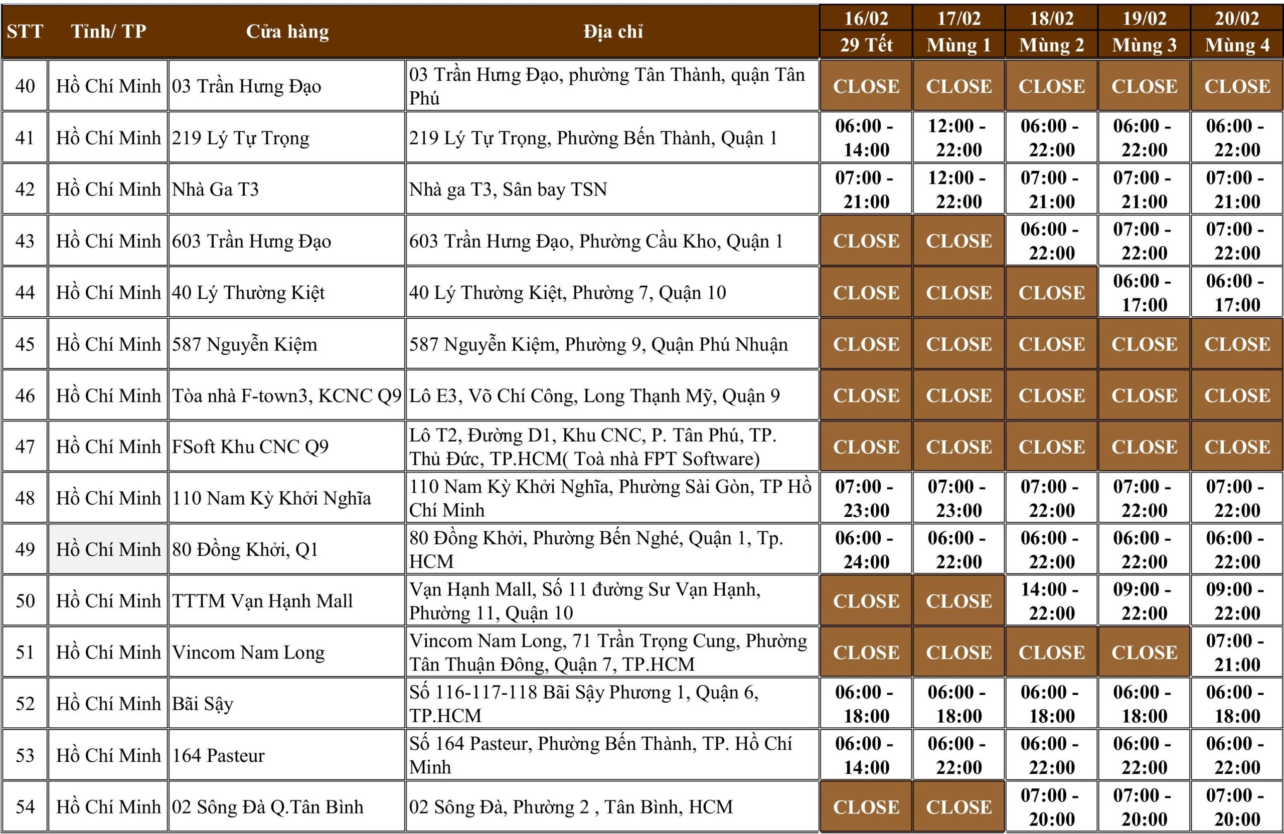 | 45 | Hồ Chí Minh | 587 Nguyễn Kiệm | 587 Nguyễn Kiệm, Phường 9, Quận Phú Nhuận | CLOSE | CLOSE | CLOSE | CLOSE | CLOSE |