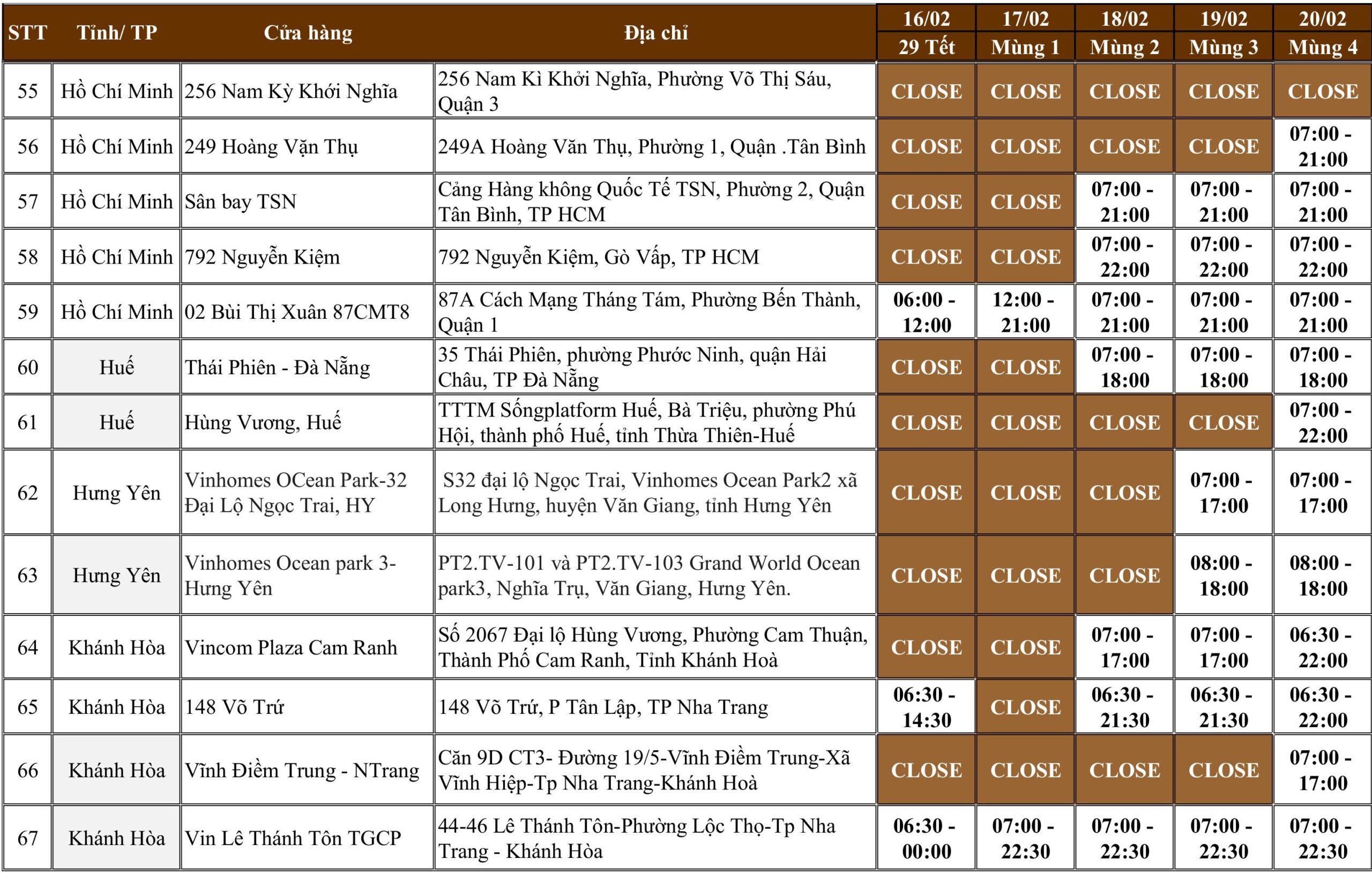 | 55 | Hồ Chí Minh | 256 Nam Kỳ Khới Nghĩa | 256 Nam Kì Khởi Nghĩa, Phường Võ Thị Sáu, Quận 3 | CLOSE | CLOSE | CLOSE | CLOSE | CLOSE |