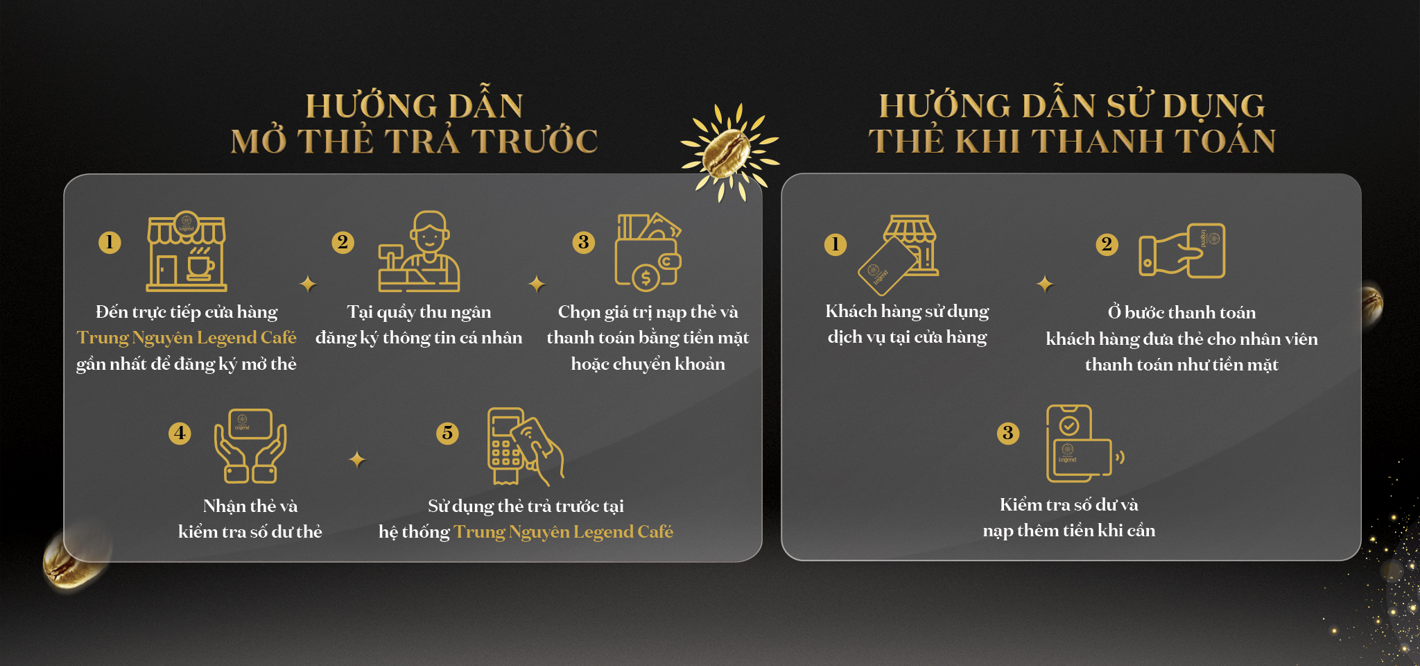 Chào mừng Quý khách đến với chương trình Thẻ Trả Trước Trung Nguyên Legend! Để giúp Quý khách có những trải nghiệm tốt nhất với chiếc thẻ đa tiện ích này, Trung Nguyên Legend Cafe gửi đến Quý khách hướng dẫn và quy định chi tiết khi sử dụng thẻ tại hệ thống cửa hàng.