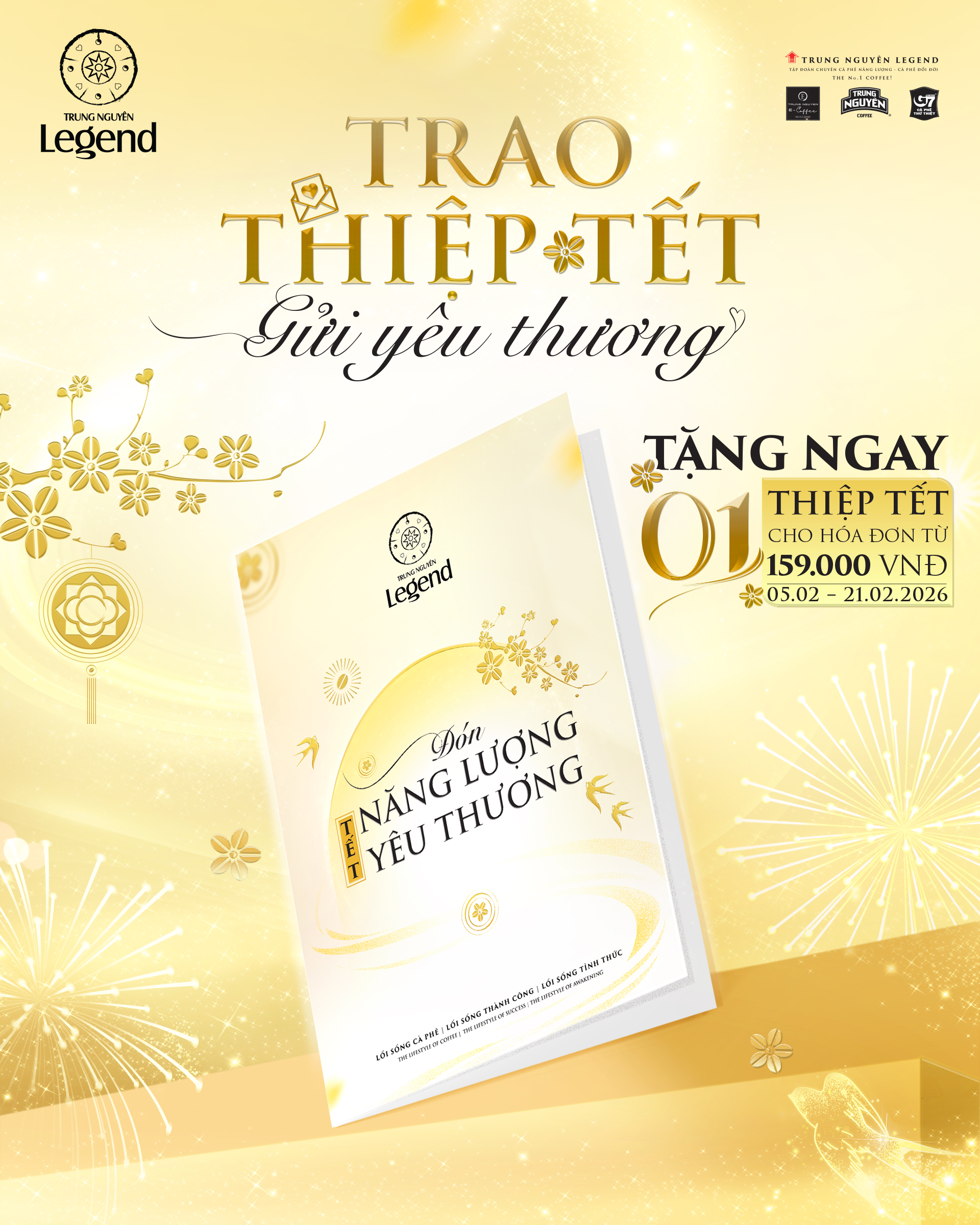 Tết là mùa của sum vầy, là lúc những lời chúc chân thành hóa thành năng lượng yêu thương. Với mỗi hóa đơn từ 159.000 VNĐ, Trung Nguyên Legend dành tặng bạn 01 Thiệp Tết xinh xắn để gửi gắm tâm tình đến những người trân quý.