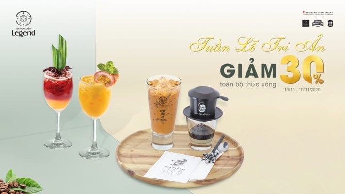 - Giảm 30% trên tổng hóa đơn thức uống (không giới hạn giá trị được giảm) tại hệ thống Không gian Trung Nguyên Legend.