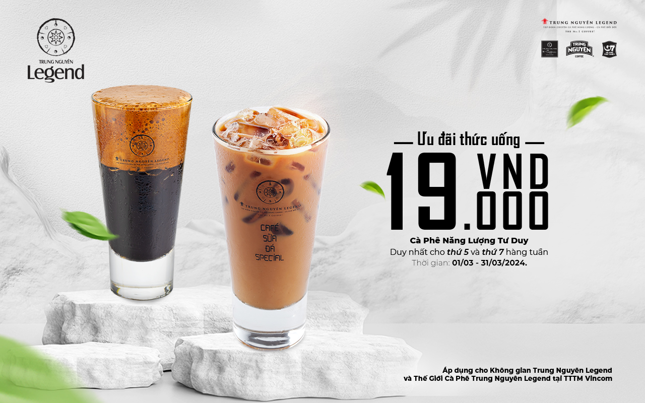 Chào tháng 03, tháng với nguồn năng lượng mới cho những hoạt động, công việc và học tập. Không gian Trung Nguyên Legend tại hệ thống Trung tâm thương mại Vincom toàn quốc chào đón bạn với các chương trình khuyến mãi hấp dẫn. Mời bạn cùng người thân, bạn bè đến thưởng thức nước ngon và tận hưởng loạt các ưu đãi nhé!