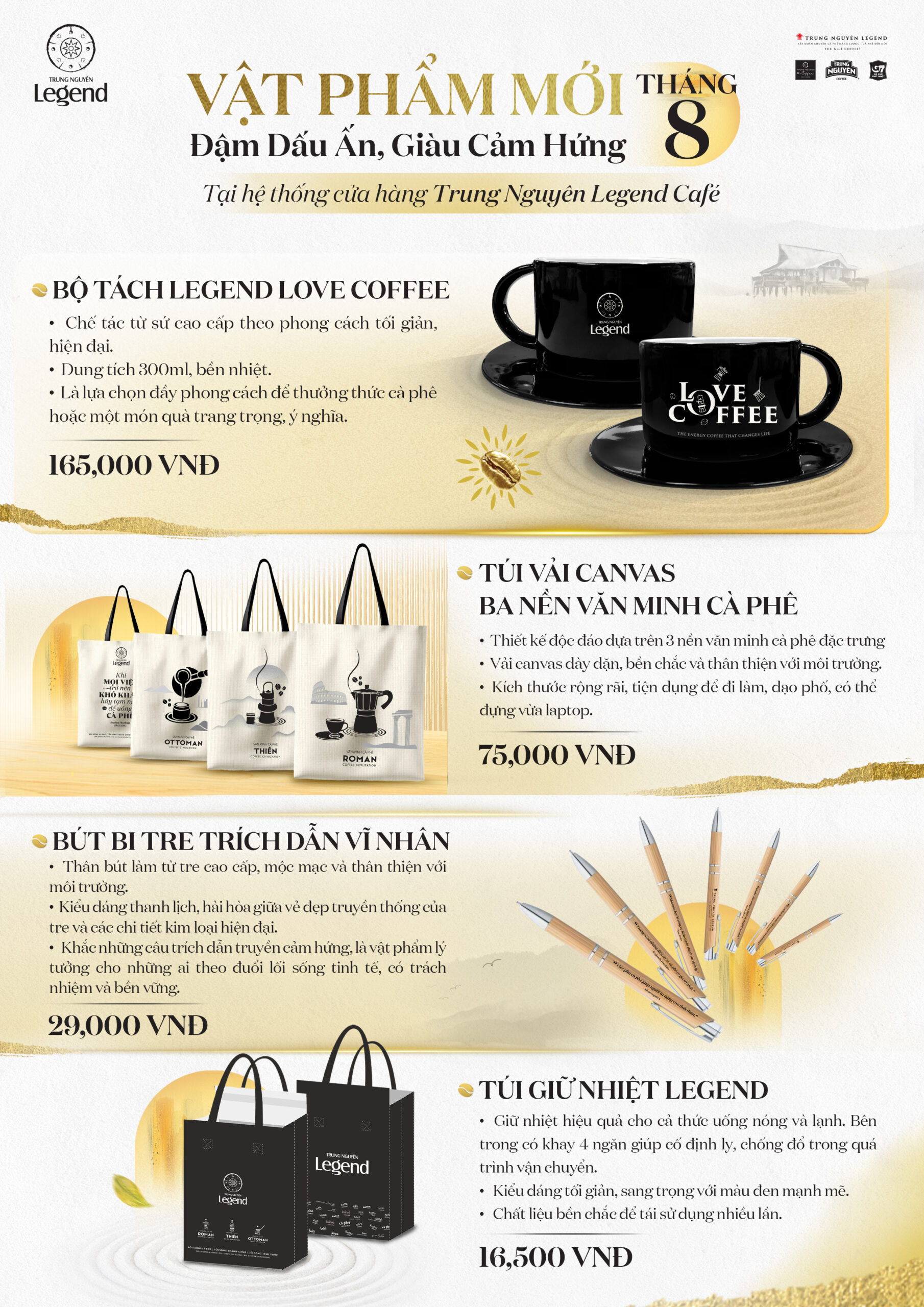 Tháng Tám đến, mang theo những nguồn năng lượng mới và những khoảnh khắc đầy cảm hứng. Để mỗi ngày của bạn thêm trọn vẹn, Trung Nguyên Legend hân hạnh giới thiệu những vật phẩm được sáng tạo bằng cả trái tim, là người bạn đồng hành lý tưởng trên Hành trình đi đến Thành công và Hạnh phúc.